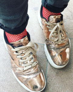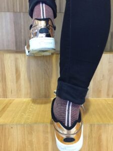 Jeg bruger dem meget, men har dem mest i lidt neutrale farver som guld, brun, lyserød eller lilla. De passer til meget i skabet og derfor har jeg dem næsten altid på. På den måde ser det pænt ud, når jeg ude hos en kunde til Garderobetjek, smider skoene og arbejder i strømpesokker. Men effekten er også lækker når de titter frem under buksekanten.